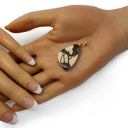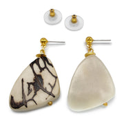 Our MARIPOSA earrings are handcrafted by experienced Colombian artisans using tagua (vegetable ivory), a rock-hard seed from a palm tree endemic to the pacific coast of South America. This exceptional material, scientifically named Phytelephas (elephant plant), matures from a liquid state into a solid, highly resilient, and creamy-white substance that is remarkably durable and closely resembles ivory. Its unique qualities allow it to be carved into various objects, polished, and dyed. These characteristics make tagua an ideal, sustainable, and ethical substitute to animal ivory. In Colombia, its harvest doesn't harm the trees and stimulates local economies, being used in jewelry, buttons, and ornaments, while also serving as a significant alternative to deforestation for farming. The earrings are completed with a top in 24K gold-plated pewter and a cataphoretic lacquer finish for enhanced durability and radiance.