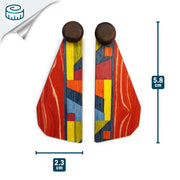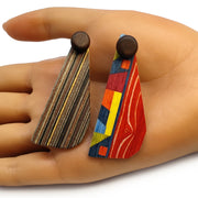 Handcrafted for versatility, our WOODIE TRIO earrings feature a reversible design with lively colors. Thanks to three layers of reinforced plywood for strength, they are very sturdy, durable, and lightweight, while a smooth beeswax finish provides lasting protection. Wear them as you wish! Wear the studs alone for a minimalistic style, or attach one of the reversible sides to complete the look. For fun variations, you can even place the reversible pieces behind your earlobes, or mix and match by wearing a stud on one ear and a full earring on the other for an asymmetrical style. They are handmade by dedicated artisans from Tenjo, a Colombian dormitory town near Bogota. While the local economy is based on agriculture, these artisans have pursued a career in handcrafts, creating their ingenious pieces in their own workshop.