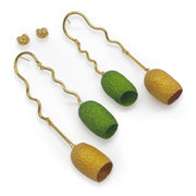 Stand out with the natural beauty of our COCOON TWIN earrings. Delicately handcrafted with genuine silk cocoons, these pieces are an eco-friendly, community-focused, and inspiring concept with elevated design. They are crafted by Colombian artisans in El Meta, a department in the vast eastern grasslands of Colombia. The cocoons are meticulously harvested and treated in ethical conditions after the moths have safely emerged, ensuring no silkworms are harmed. They are then dyed with natural pigments, waterproofed, and varnished for a long-lasting and strong quality, so they hold their shape with normal wear, and preserve a natural texture and look. The design is completed with a 24K gold-plated bronze structure, coated with a protective cataphoretic lacquer for higher durability, and the posts are hypoallergenic. All the artisans involved are female heads of household who have found in this project a sustainable income source to provide for their families.