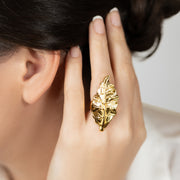 Our FOLIA ring is handcrafted by Colombian artisans passionate about pre-Columbian cultures and the inherent beauty of nature. Its delicate and elegant design draws inspiration from Colombia's extraordinary biodiversity, a nation celebrated as the second most biodiverse country in the world after Brazil. This piece is meticulously handcrafted in 24K gold-plated pewter. A protective cataphoretic lacquer finish has been applied for increased durability and a refined glossy touch.