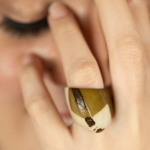 View full detailsOur GÉNESIS CURVO ring is handcrafted by experienced Colombian artisans using tagua (vegetable ivory), a rock-hard seed from a palm tree endemic t...