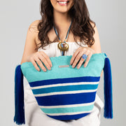 CARE INSTRUCTIONS: Hand washing is strongly recommended. If machine washing, use a protective mesh bag and select a delicate cycle with cold water. A fabric softener is recommended for the final rinse in both methods to maintain thread softness. Do not bleach or use hot water. Air dry in the shade. If ironing is required, use a medium heat setting and place a thin protective cloth between the bag and the iron. When not in use, store the bag in the provided pouch in a dry area, avoiding humidity. Please check the information tag inside the bag.