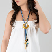 Handcrafted by Colombian jewelers, our CORDÚLA necklace celebrates pre-Columbian craftsmanship. Its flowing design showcases a central pendant, recalling a nose ring, a distinctive symbol of status and kinship, often elaborated in various patterns. Leather cords, stones, and other pre-Columbian inspired charms (small nose ring, Tairona frog, and leaf) add a graceful touch to the necklace. The pendant includes a back hoop and sliding barrel to adjust and secure the cords' length. A direct inspiration from exhibits at the Museum of Gold in Bogotá, Colombia, home to the world's largest pre-Columbian gold collection, the pendant and charms are crafted in 24K gold-plated pewter with a cataphoretic lacquer finish for higher durability and radiance.