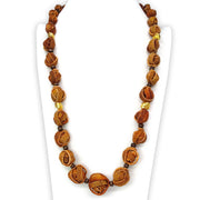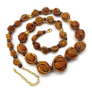 MATERIALS: Dyed and treated orange peels, wooden beads, 24K gold-plated pewter with a protective cataphoretic lacquer finish for enhanced durability, and a waxed cotton cord.
