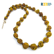 MATERIALS: Dyed and treated orange peels, wooden beads, 24K gold-plated pewter with a protective cataphoretic lacquer finish for enhanced durability, and a waxed cotton cord.