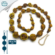 If you appreciate a distinctive style, natural materials, and vibrant colors, our NARANJITA necklace is for you! Long and adjustable, it's handcrafted by two female artisans in Cajicá, a Colombian commuter town near Bogotá. There, they collect discarded orange peels from fresh juice shops and transform them into gorgeous, exclusive necklaces that maintain the fruit's natural aroma. The creation of each piece involves a meticulous cleaning of the peels, boiling and dyeing them with natural and mineral pigments, different drying stages, cutting them into strips, and finally mounting them on a very sturdy waxed cotton cord. Each necklace is treated to prevent deterioration over time. It's decorated with wooden beads and 24K gold-plated pewter accents, which are protected with a special cataphoretic lacquer for lasting shine and durability. What are you waiting for? Order yours today!