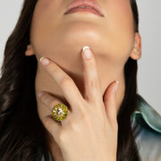 Our ECOSOL ring is an ingenious design crafted from recycled and dyed plastic liners obtained from the interior of beer and soda bottle caps. This brilliant transformation of often-discarded and underestimated materials makes this ring an original and eco-friendly conversation piece. The ring's 925 sterling silver structure has an adjustable band that fits any finger. Additionally, the golden accents on the front are made from 24K gold-plated silver. Each ring is handmade by a young and creative artisan from Bogotá, Colombia's capital, who focuses on ethical and environmentally friendly designs, prioritizing eco-responsibility and sustainability. When you choose this ring, you're not just wearing a beautiful accessory; you're also making a meaningful statement about your commitment to sustainable design and ethical craftsmanship.