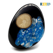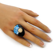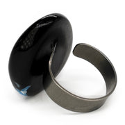 Is it time for a new ring with an inspiring story and a distinctive aesthetic? We got you covered! The creative design of our NATÜA ring highlights recycled crushed white corn (white pieces in the blue area) and recovered wood (round inlay) embedded in resin, an artistic way to transform discarded materials. The ring is completed with an adjustable and hypoallergenic stainless steel band, meticulously bonded using a specialized, high-strength technique for a secure fit. To adjust the size, simply hold the band with one hand and gently pull or push the open end with the other. This ring is handmade by a couple of artisans from Tenjo, a Colombian commuter town near Bogota. While the local economy is based on agriculture, this couple have pursued a career in handcrafts, creating brilliant pieces in their own workshop.