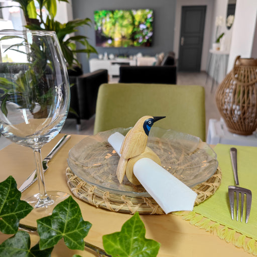 Ver todos los detallesTallado y pintado a mano por artesanos colombianos, nuestro anillo de servilleta de madera ZANATE es un tributo artístico a la asombrosa biodivers...
