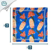 Enveloppez-vous de l'énergie vibrante de la Colombie avec ce foulard exquis. Conçu par l'artiste, l'imprimé original met en vedette l'étonnant Gingembre Pin (Pinecone Ginger), connu pour le shampoing naturel et parfumé qu'il libère lorsque vous pressez doucement sa fleur mature. Cette pièce polyvalente est fabriquée à partir de soie synthétique, un tissu luxueux créé à partir de bouteilles en plastique recyclées. Vous bénéficiez du même toucher lisse et doux et du même tombé fluide que la soie traditionnelle, mais dans une version écoresponsable. Portez-le avec élégance autour du cou ou joliment stylisé dans vos cheveux ; sa polyvalence en fait l'accessoire parfait pour toutes les occasions. Choisir ce foulard est plus qu'une simple déclaration de style; c'est un engagement actif envers la mode durable et le soutien à la création artisanale originale.