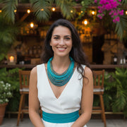 Make your next celebration or special night out unforgettable with our INSPIRA necklace, a piece designed to make you sparkle. Comfortable and chic, this piece can easily complement a smart casual or elegant outfit. Handmade by a Colombian female artisan in Bogotá, it’s crafted with strong and smooth synthetic silk cords. The twisting and coiling techniques create a necklace that is lightweight, versatile, and visually striking. The piece is completed with a discreet gold-plated stainless steel ball clasp. This design is inspired by the rich influence of African culture in Colombia, part of the unique heritage forged during the colonial era. This influence is present in the country's music, dance, and gastronomy, as Colombia is one of the Spanish-speaking nations with the largest Afro-descendant population in Latin America. Style, inspiration, and history in a single necklace. Don't miss out on yours!