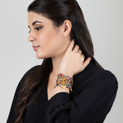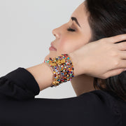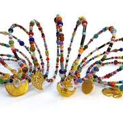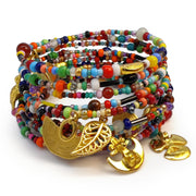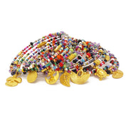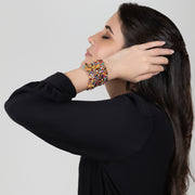 A nossa bracelete ESPIRAL é uma peça artesanal, criada por artesãos colombianos e inspirada nas culturas pré-colombianas. Este acessório de cores vivas é a escolha perfeita para dar um toque de fantasia ao seu visual. Para um estilo jovem e divertido, os nossos artesãos usaram diversos tons, combinando-os com a elegância de detalhes dourados. Pequenos pendentes de inspiração pré-colombiana, com representações de pássaros, argolas de nariz, uma folha e uma tartaruga, complementam harmoniosamente a bracelete. Os motivos são diretamente inspirados na ourivesaria do Museu do Ouro em Bogotá, Colômbia, que abriga a maior coleção de ouro pré-colombiano do mundo. Os pendentes são feitos de estanho banhado a ouro de 24 quilates, com acabamento em laca cataforética para maior durabilidade e brilho, juntamente com contas e pedras semipreciosas. Basta dar voltas no pulso para a usar.