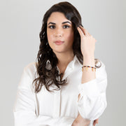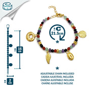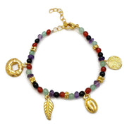A nossa pulseira ARCOÍRIS é uma criação artesanal de joalheiros colombianos, com inspiração nas culturas pré-colombianas e no seu rico simbolismo. Se procura um design cheio de significado, ao mesmo tempo leve e delicado, esta peça é para si! Nesta pulseira, os nossos artesãos destacam pequenos berloques de inspiração pré-colombiana (um anel nasal da civilização Tairona da antiga Colômbia, uma folha e o calendário asteca), bem como um grão de café, um símbolo que reflete a dinâmica cultura do café desenvolvida na Colômbia de hoje. O brilho, a elegância e o lustre das pedras de ágata, ónix, jade e ametista adornam e completam o design. Os berloques e outras peças douradas são feitos em estanho banhado a ouro fino de 24 quilates, com um acabamento protetor de laca cataforética para maior durabilidade e brilho.